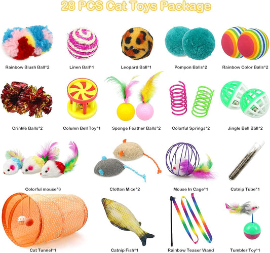 27Pcs Cat Toys Kitten Toys Assorted,Cat Tunnel Catnip Fish Feather Teaser Wand Fish Fluffy Mouse Mice Balls Tumbler Mouse Color Funny Cat Stick and Bells Toys for Cat Puppy Kitty.